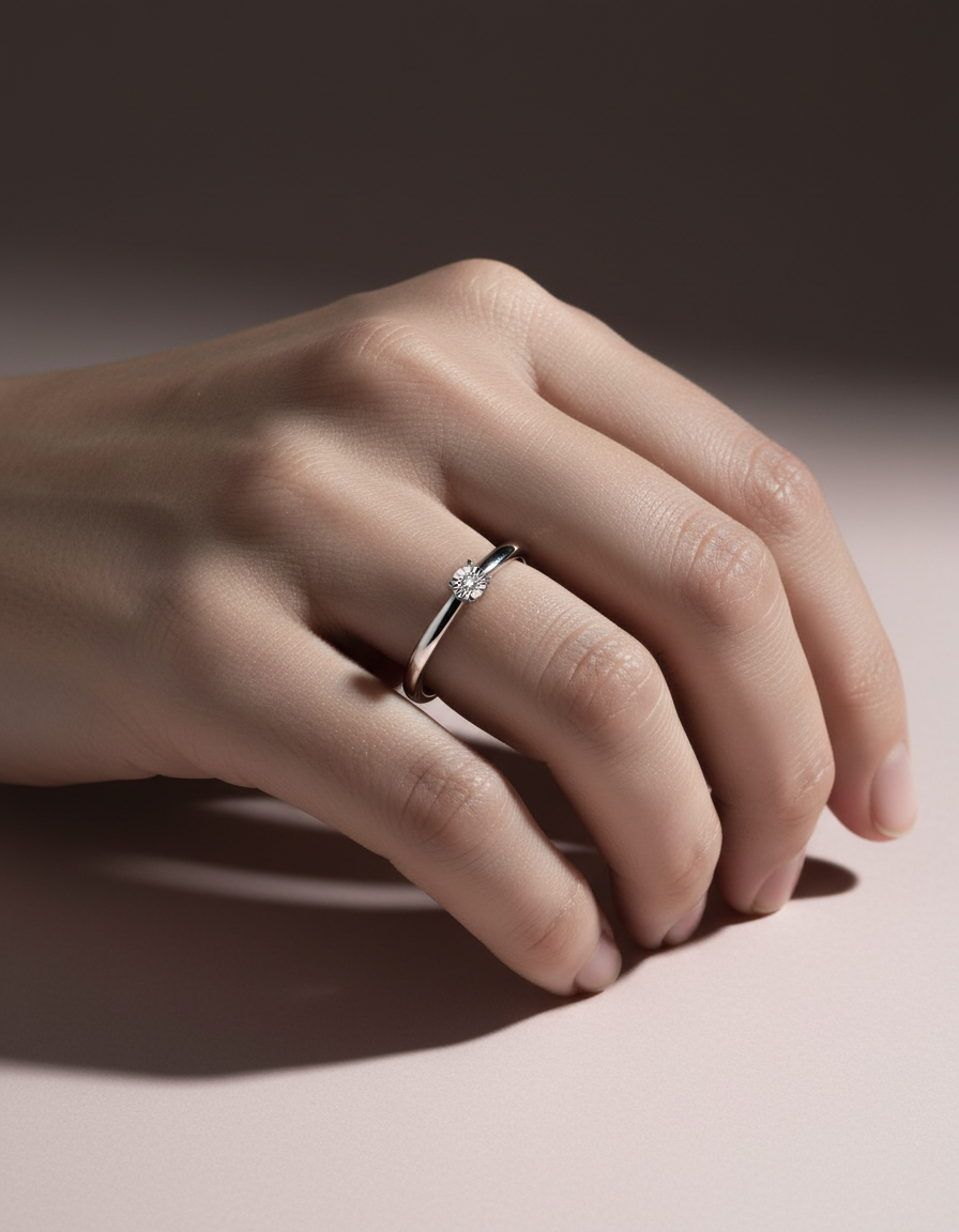 Klasyczny pierścionek z białego złota z 1 diamentem o masie 0.01 ct, osadzonym w szlifowanej koronie.