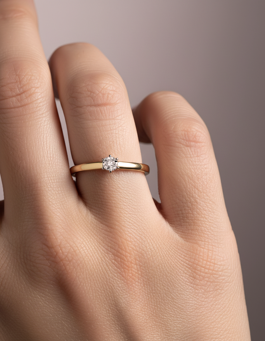 Klasyczny pierścionek z żółtego złota z 1 diamentem 0,05 ct w koronie z białego złota, korona posiada diamentowany otok, co dodatkowo podbija brylancję, próba 585.