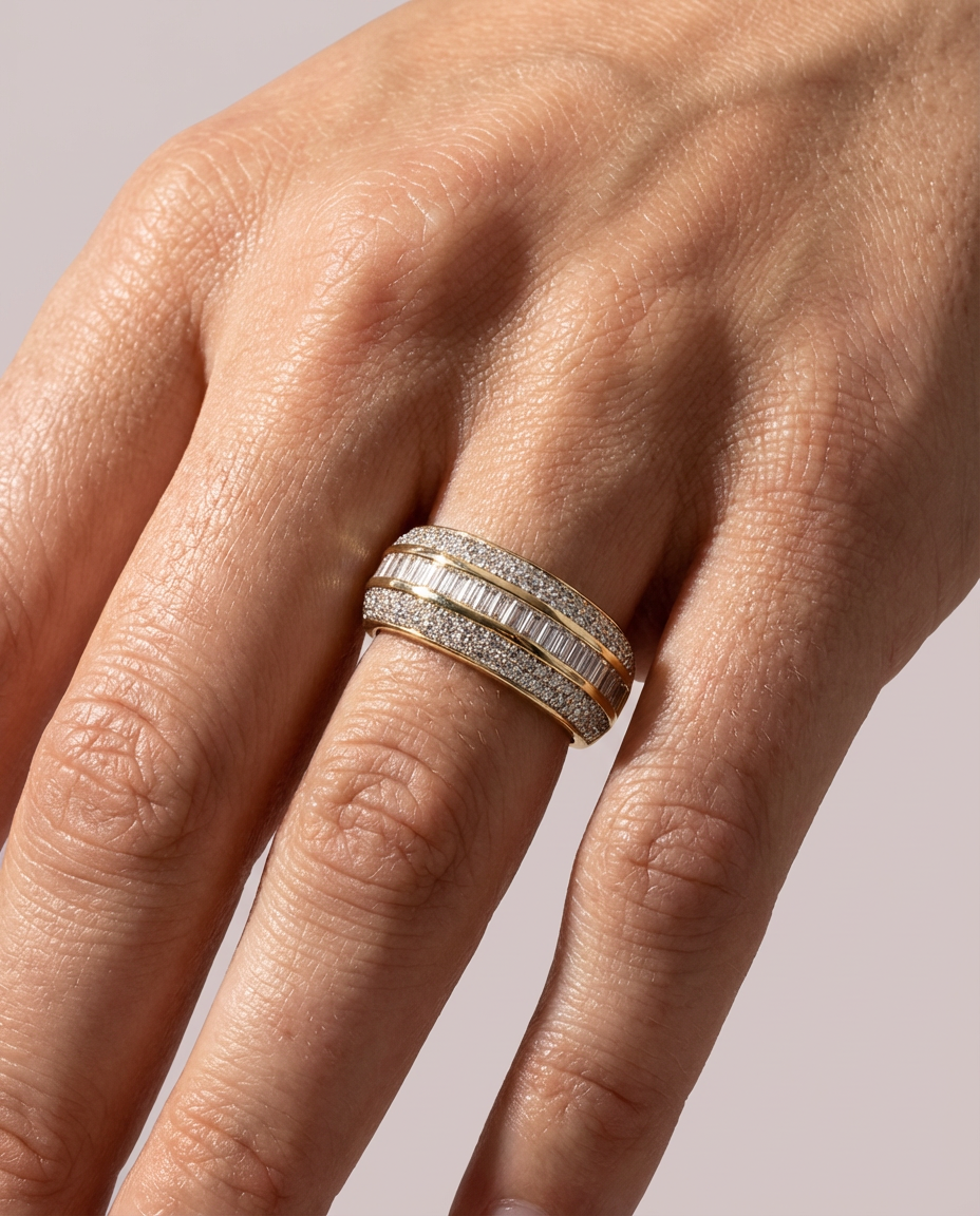 Luksusowy pierścionek złoty obrączkowy, wysadzany 136 białymi diamentami, środek wysadzany diamentami o szlifie bagietowym, próba 585.
