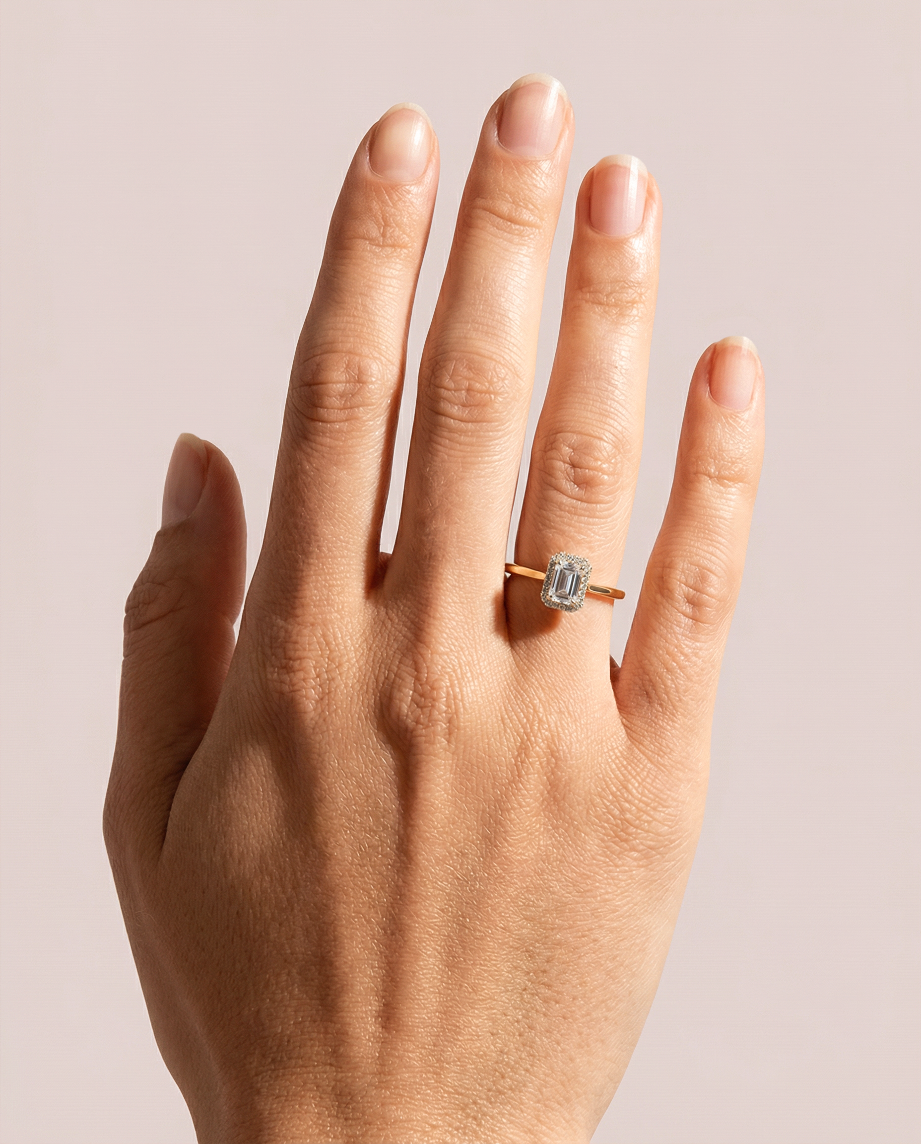 Diamenty, perfekcyjnie osadzone w złotych krapach, tworzą harmonijną ramkę wokół głównego kamienia, podkreślając jego piękno i dodając blasku.