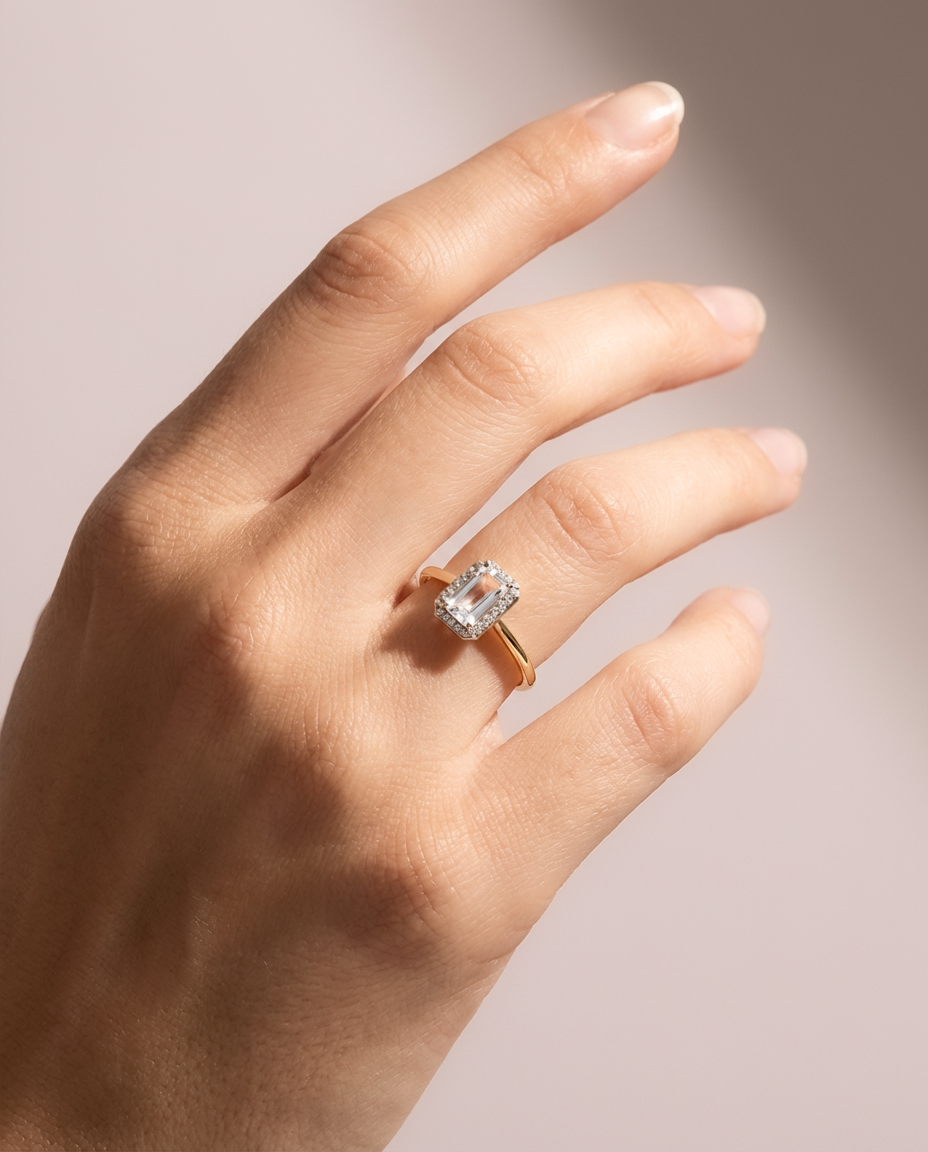 Pierścionek złoty z prostokątnym topazem białym w otoku diamentów, próba 585.