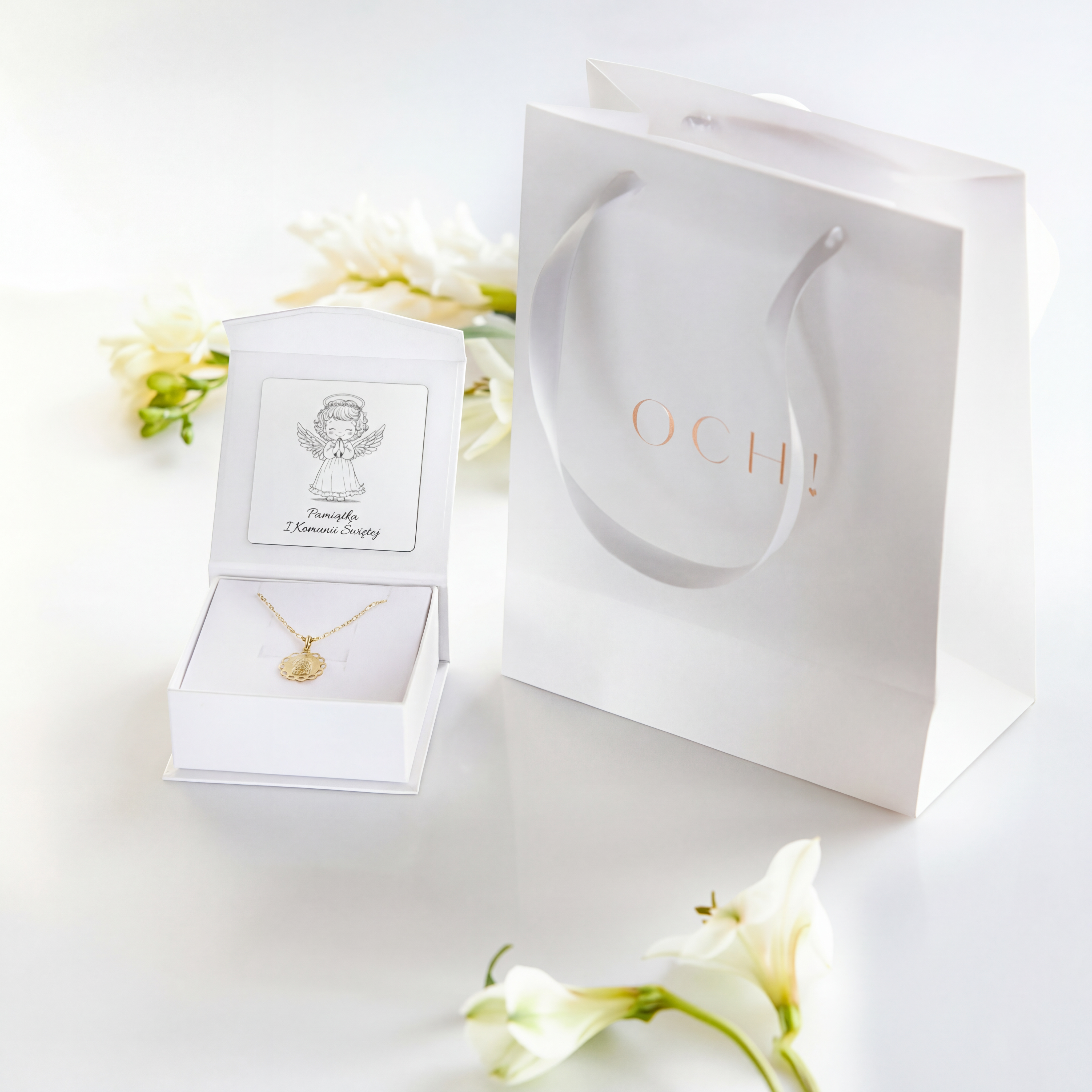 Subtelna ilustracja aniołka w połączeniu z klasycznym napisem „Pamiątka I Komunii Świętej” tworzy ponadczasową kompozycję, idealnie wpisującą się w wyjątkowy charakter tej ważnej uroczystości. Tabliczka stanowi eleganckie dopełnienie opakowania, w którym umieszczana jest zamówiona biżuteria komunijna, nadając jej jeszcze bardziej odświętną i pamiątkową formę.