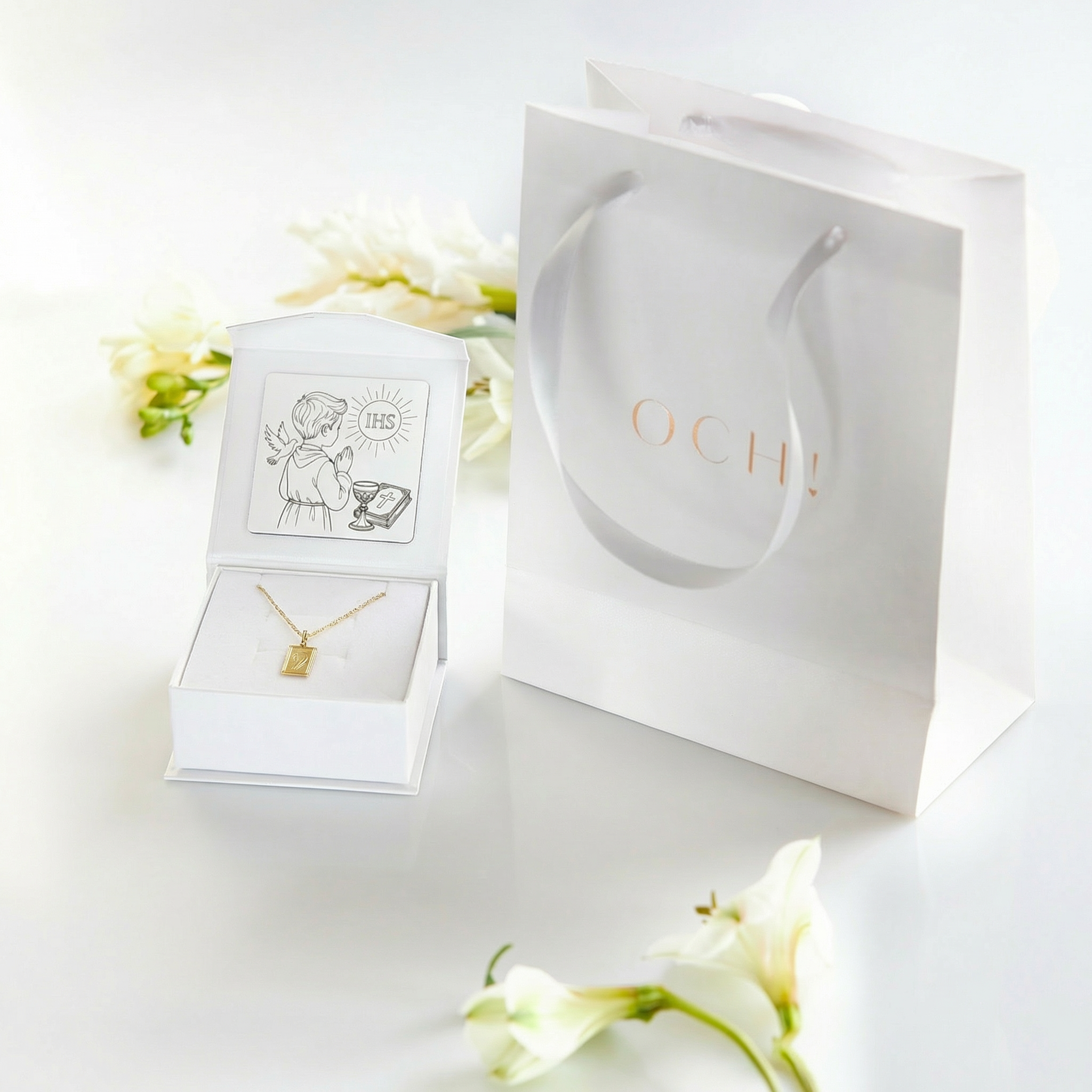 Tabliczka biała do pudełka komunijnego z motywem modlącego się chłopca i symboli eucharystycznych to wyjątkowy detal, który nadaje opakowaniu elegancki i uroczysty charakter. Umieszczona wewnątrz ozdobnego pudełka na biżuterię komunijną, podkreśla unikatowość prezentu.