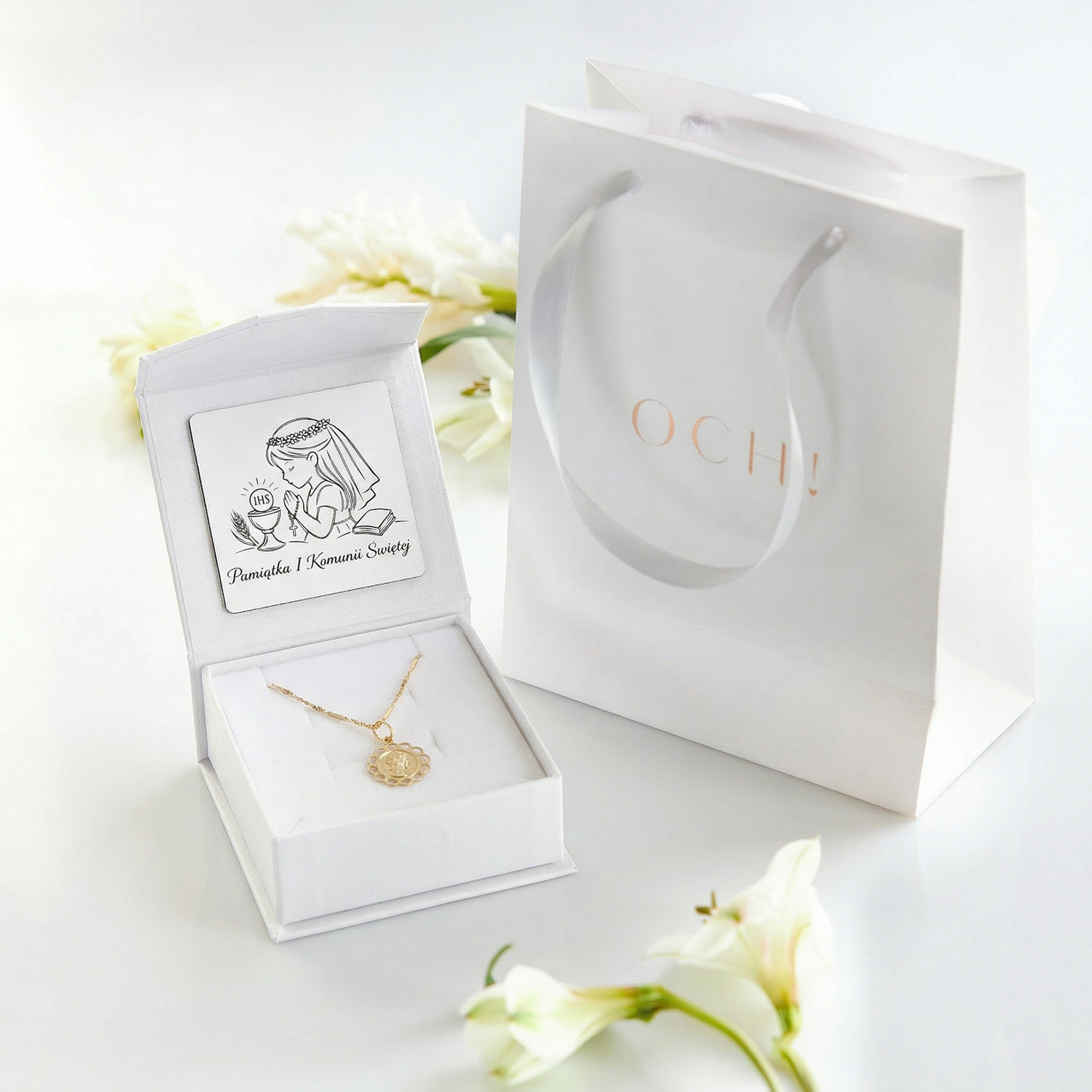 Tabliczka biała do pudełka komunijnego z motywem modlącej się dziewczynki i symboli eucharystycznych to wyjątkowy detal, który nadaje opakowaniu elegancki i uroczysty charakter. Umieszczona wewnątrz ozdobnego pudełka na biżuterię komunijną, podkreśla unikatowość prezentu.