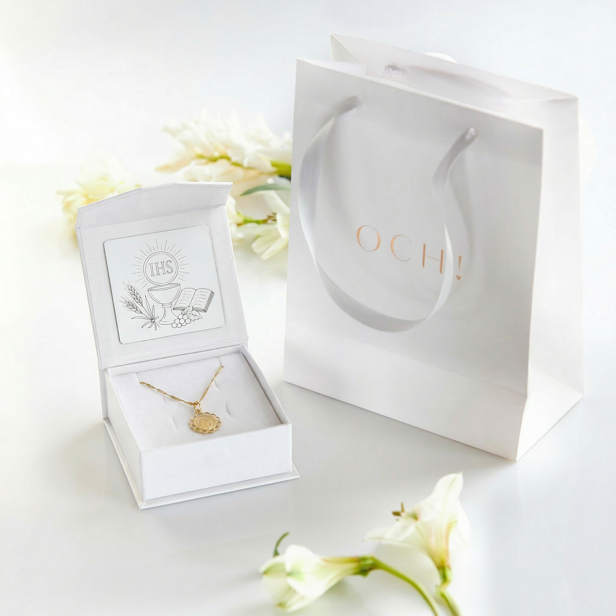 Tabliczka biała do pudełka komunijnego z motywem symboli eucharystycznych to wyjątkowy detal, który nadaje opakowaniu elegancki i uroczysty charakter. Umieszczona wewnątrz ozdobnego pudełka na biżuterię komunijną, podkreśla unikatowość prezentu.
