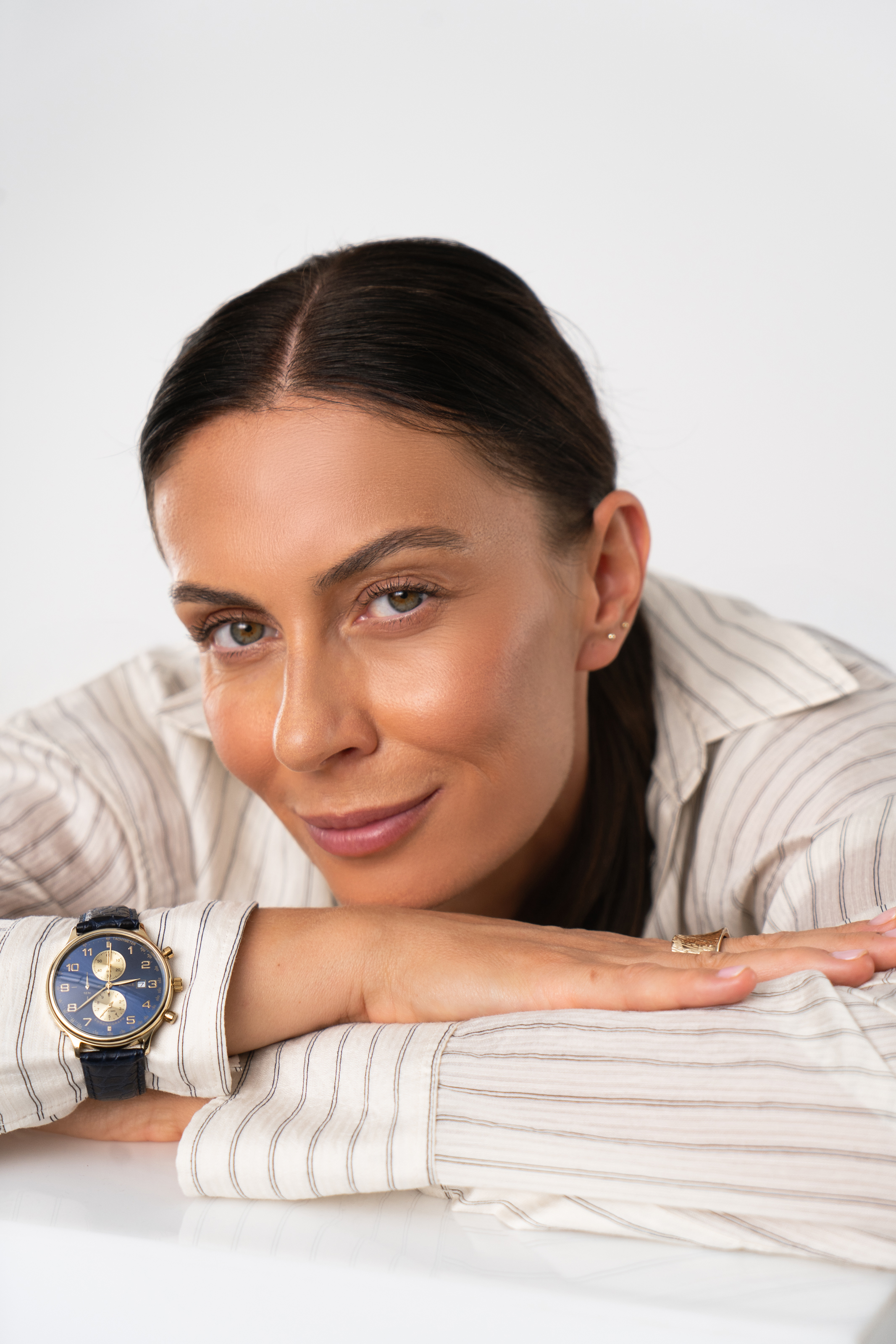 Zegarek unisex, którego koperta, pokrętło i dekielek wykonane są z żółtego złota, a pasek to ekskluzywna skóra naturalna w kolorze czerni i granatu.